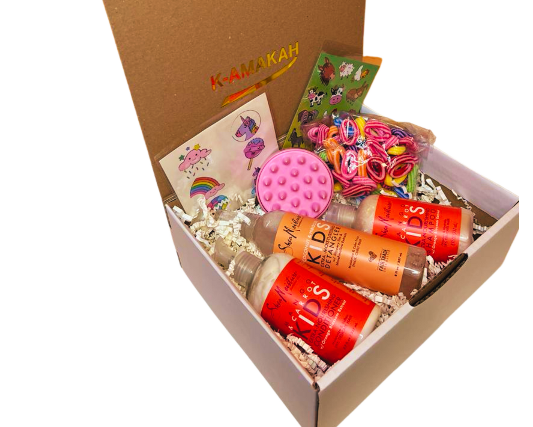 This shea moisture box Includes Coconut & Hibiscus Hair Detangler, Shampoo Brush, Kids Headband, Kids Tattoos, and Stickers for Endless Fun